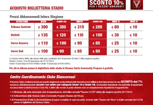 Via alla campagna abbonamenti 2017-2018 del Vicenza Calcio che partirà lunedì 17 luglio. I vecchi abbonati potranno usufruire del diritto di prelazione sul posto a sedere da lunedì 17 luglio fino a sabato 29 luglio.La sottoscrizione per i nuovi abbonati sarà possibile da martedì 1 agosto. L’abbonamento è acquistabile presso la sede del Vicenza Calcio, in via Schio 21 a Vicenza e in modalità on-line collegandosi al sito listicket.com.