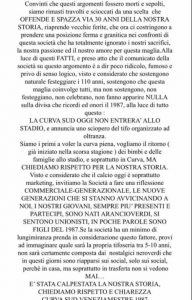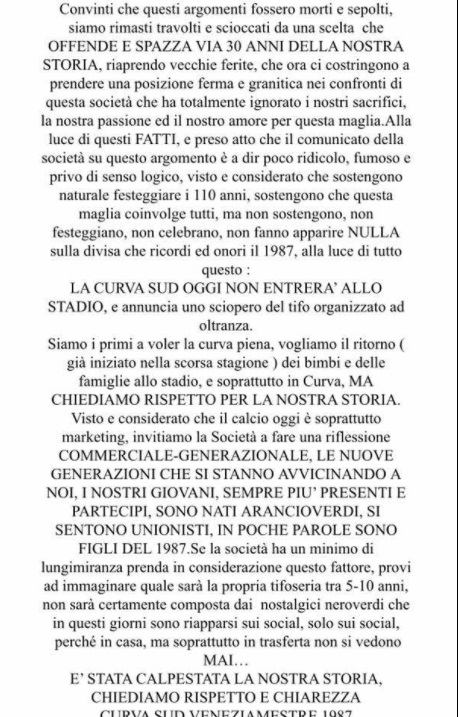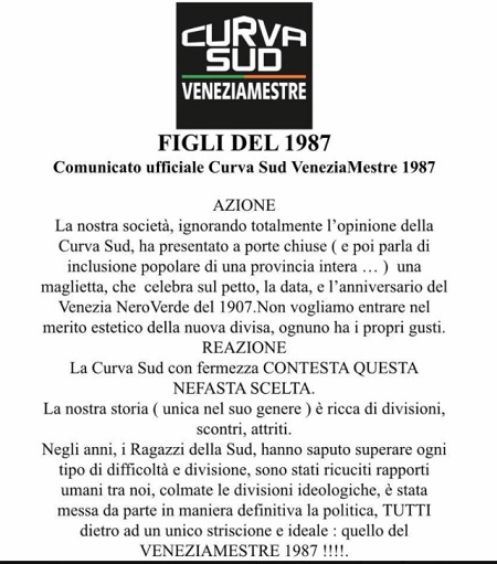Questo il volantino che la Curva Sud VeneziaMestre 1987 distirbuirà oggi allo stadio Penzo. Viene ribadita la posizione contraria alle nuove maglie e si attacca ancora la società, che per ora ha deciso di non modificare la patch con il “110” apposto nella parte superiore della nuova divisa