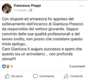 Trivenetogoal news: la notizia che si è diffusa in queste ore del licenziamento del responsabile del settore giovanile del Vicenza Calcio Gianluca Presicci ha suscitato la contrariata reazione del rappresentante di Boreas Capital Francesco Pioppi, che così si è sfogato su Facebook: “Con stupore ed amarezza ho appreso del sollevamento dell’incarico di Gianluca Presicci da responsabile del settore giovanile. Seppur convinto delle sue qualità professionali e del lavoro svolto, non posso che costatare questo triste epilogo…  Caro Gianluca ti auguro successo e spero che questo sia un arrivederci… con profonda stima!!!!”