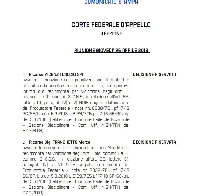 Nella mattinata odierna il collegio legale del Vicenza Calcio ha discusso nella sede della Corte d’Appello federale il ricorso contro la penalizzazione di quattro punti inflitta in primo grado dal Tribunale federale nazionale al club biancorosso. I legali hanno insistito sul vizio di forma del procedimento, unico appiglio possibile aggiungendo la richiesta di cancellazione della sanzione in quanto il club è, nel frattempo, fallito e in esercizio provvisorio. La Corte ha aperto uno spiraglio e si è riservata di prendere una decisione in merito, anche relativamente al deferimento di Marco Franchetto. Nei prossimi giorni arriverà la risposta definitiva.