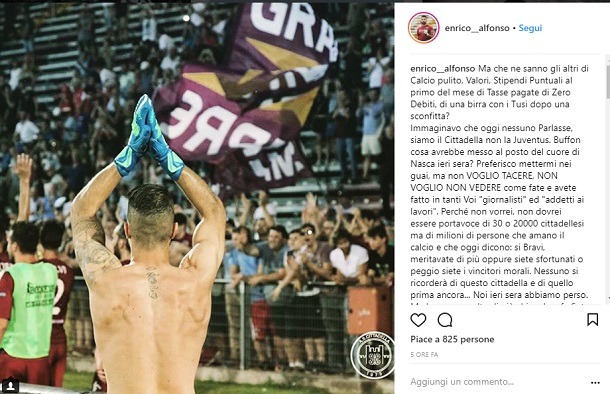 Durissimo sfogo del portiere Enrico Alfonso dopo l’uscita di scena dai playoff in semifinale contro il Frosinone: “enrico__alfonsoMa che ne sanno gli altri di Calcio pulito, Valori, Stipendi Puntuali al primo del mese di Tasse pagate di Zero Debiti, di una birra con i Tusi dopo una sconfitta? Immaginavo che oggi nessuno Parlasse, siamo il Cittadella non la Juventus. Buffon cosa avrebbe messo al posto del cuore di Nasca ieri sera? Preferisco mettermi nei guai, ma non VOGLIO TACERE, NON VOGLIO NON VEDERE come fate e avete fatto in tanti Voi “giornalisti” ed “addetti ai lavori”. Perché non vorrei, non dovrei essere portavoce di 30 o 20000 cittadellesi ma di milioni di persone che amano il calcio e che oggi dicono: si Bravi, meritavate di più oppure siete sfortunati o peggio siete i vincitori morali. Nessuno si ricorderà di questo cittadella e di quello prima ancora… Noi ieri sera abbiamo perso. Ma ha perso molto di più chi vede e fa finta di niente, chi sa e tace. Bravi i vincitori e onore ai Vinti in questo caso ma può bastare? Non può Bastare… Sono orgoglioso di quanto fatto in questi 3 anni. Grazie a tutti ai miei compagni in Primis al Mister allo staff alla Famiglia del Cittadella ai tifosi Granata Tutti. Dicono: Granata per un giorno, Granata per sempre…Io dico che ci sarà qualcosa di Granata in me per tutta la Vita.ed é così che Auguro a tutti un Sabato, auguro ancor di più una domenica, di quelle vere però da Cittadellesi per respirarne l’atmosfera, per respirarne la magia e per restare, come la bandiera sullo sfondo in questa foto GRANATA PER SEMPRE.E Per quanto mi riguarda, Io speriamo che me la cavo! GRAZIE DI CUORE ❤”