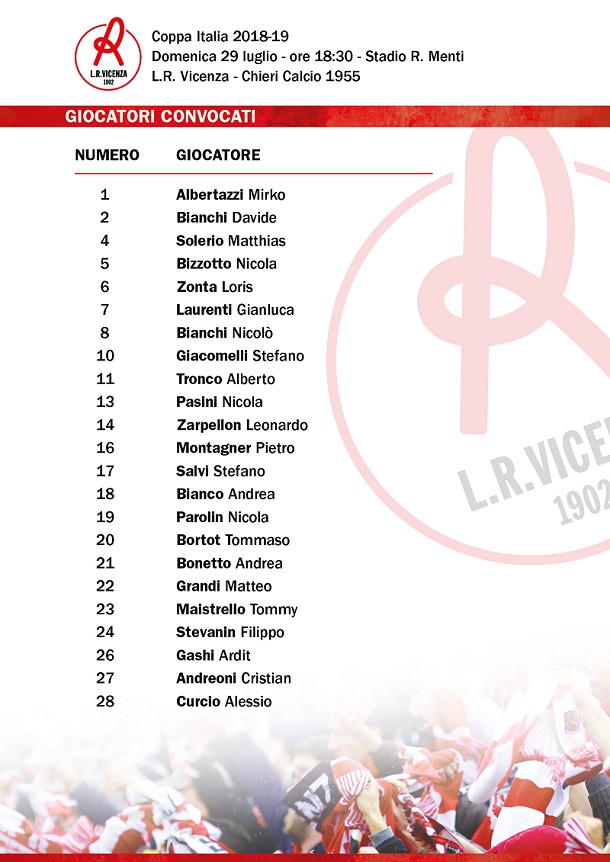 Sono stati diramati poco fa i convocati per la prima di Coppa Italia in programma domani pomeriggio alle 18.30 allo stadio Menti fra Vicenza e Chieri. Allo stesso tempo si conoscono i numeri di maglia: al capitano Nicola Bizzotto il 5, a Stefano Giacomelli la maglia numero 10, mentre Curcio ha scelto la numero 28. Libera la maglia numero 9, in attesa del botto di mercato per il ruolo di centravanti