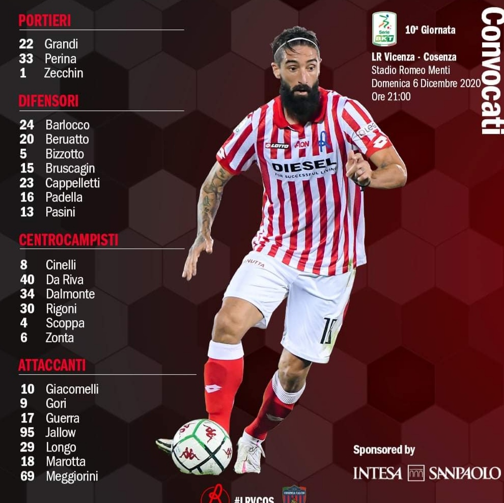Vicenza-Cosenza, I convocati: out Nalini, Vandeputte e Pontisso